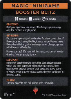 2 players | 2 packs | 10 minutes OBJECTIVE: Best your opponent in a series of fast Magic games using only the cards in a single pack! GET READY: Each player opens a pack and makes four face-down piles of three cards each using the Magic cards inside. Players make their piles with the goal of winning a series of Magic games with these modified rules: Players start at 5 life, have infinite mana, and cannot lose by drawing from an empty library. LET'S PLAY: Randomly determine who goes first. Each player chooses which pile their opponent will use for each round. Then both players draw all three of their cards and play a game of Magic. When a player loses a game, they get to go first in the next game. TO WIN: The first player to win two games wins the match.