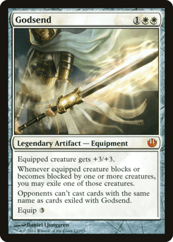 Equipped creature gets +3/+3. Whenever equipped creature blocks or becomes blocked by one or more creatures, you may exile one of those creatures. Your opponents can't cast spells with the same name as a card exiled with Godsend. Equip {3}