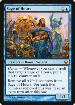 Heroic — Whenever you cast a spell that targets this creature, put a +1/+1 counter on it. Remove all +1/+1 counters from this creature: For each five counters removed this way, take an extra turn after this one.