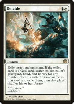Exile target enchantment. If the exiled card is a God card, search its controller's graveyard, hand, and library for any number of cards with the same name as that card and exile them. Then that player shuffles.