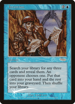 Search your library for three cards and reveal them. Target opponent chooses one. Put that card into your hand and the rest into your graveyard. Then shuffle.