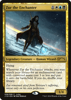 Flying Whenever Zur attacks, you may search your library for an enchantment card with mana value 3 or less, put it onto the battlefield, then shuffle.