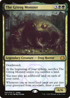 Deathtouch At the beginning of your upkeep, sacrifice The Gitrog Monster unless you sacrifice a land. You may play an additional land on each of your turns. Whenever one or more land cards are put into your graveyard from anywhere, draw a card.
