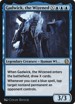When Gadwick enters, draw X cards. Whenever you cast a blue spell, tap target nonland permanent an opponent controls.