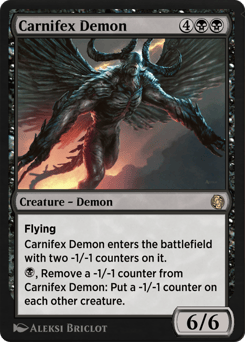 Flying This creature enters with two -1/-1 counters on it. {B}, Remove a -1/-1 counter from this creature: Put a -1/-1 counter on each other creature.