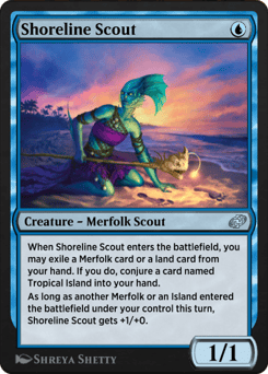 When Shoreline Scout enters the battlefield, you may exile a Merfolk card or a land card from your hand. If you do, conjure a card named Tropical Island into your hand. As long as another Merfolk or an Island entered the battlefield under your control this turn, Shoreline Scout gets +1/+0.