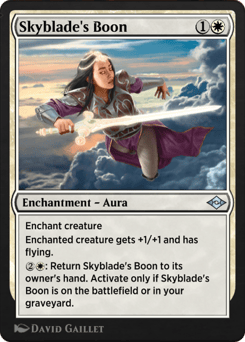 Enchant creature Enchanted creature gets +1/+1 and has flying. {2}{W}: Return Skyblade's Boon to its owner's hand. Activate only if Skyblade's Boon is on the battlefield or in your graveyard.