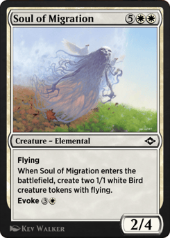 Flying When this creature enters, create two 1/1 white Bird creature tokens with flying. Evoke {3}{W} (You may cast this spell for its evoke cost. If you do, it's sacrificed when it enters.)