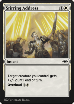 Target creature you control gets +2/+2 until end of turn. Overload {5}{W} (You may cast this spell for its overload cost. If you do, change "target" in its text to "each.")