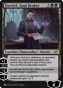 [+1]: Until your next turn, whenever an opponent attacks you and/or planeswalkers you control, they discard a card. If they can't, they sacrifice an attacking creature. [−2]: Accept one of Davriel's offers, then accept one of Davriel's conditions. [−3]: Target creature an opponent controls perpetually gets -3/-3.