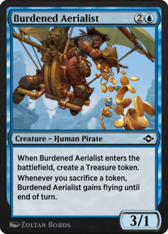 When this creature enters, create a Treasure token. (It's an artifact with "{T}, Sacrifice this token: Add one mana of any color.") Whenever you sacrifice a token, this creature gains flying until end of turn.
