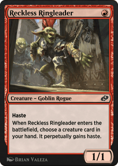 Haste When Reckless Ringleader enters the battlefield, choose a creature card in your hand. It perpetually gains haste.