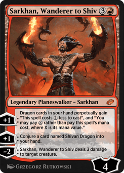 [+1]: Dragon cards in your hand perpetually gain "This spell costs {1} less to cast," and "You may pay {X} rather than pay this spell's mana cost, where X is its mana value." [+1]: Conjure a card named Shivan Dragon into your hand. [−2]: Sarkhan, Wanderer to Shiv deals 3 damage to target creature.