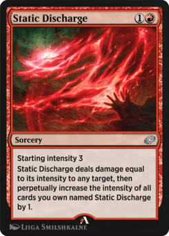 Starting intensity 3 This sorcery deals damage equal to its intensity to any target. Then cards you own named Static Discharge intensify by 1.