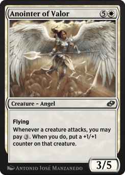 Flying Whenever a creature attacks, you may pay {3}. When you do, put a +1/+1 counter on that creature.
