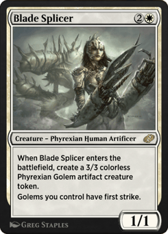 When this creature enters, create a 3/3 colorless Phyrexian Golem artifact creature token. Golems you control have first strike.