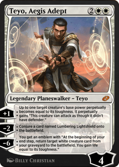 [+1]: Up to one target creature's base power perpetually becomes equal to its toughness. It perpetually gains "This creature can attack as though it didn't have defender." [−2]: Conjure a card named Lumbering Lightshield onto the battlefield. [−6]: You get an emblem with "At the beginning of your end step, return target white creature card from your graveyard to the battlefield. You gain life equal to its toughness."