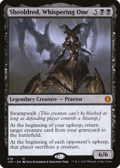 Swampwalk (This creature can't be blocked as long as defending player controls a Swamp.) At the beginning of your upkeep, return target creature card from your graveyard to the battlefield. At the beginning of each opponent's upkeep, that player sacrifices a creature of their choice.