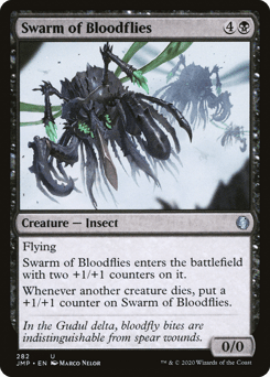 Flying This creature enters with two +1/+1 counters on it. Whenever another creature dies, put a +1/+1 counter on this creature.