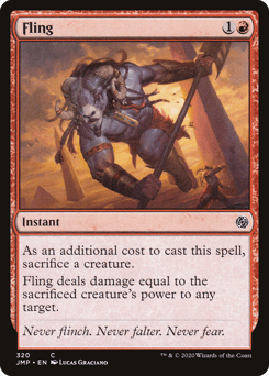 As an additional cost to cast this spell, sacrifice a creature. Fling deals damage equal to the sacrificed creature's power to any target.