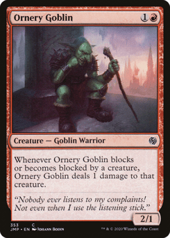 Haste (This creature can attack and {T} as soon as it comes under your control.) Other Goblin creatures you control get +1/+1 and have haste.