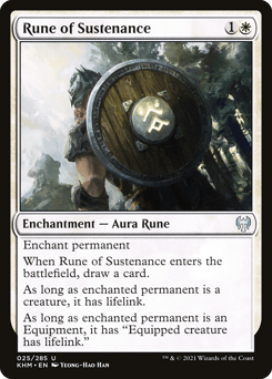 Enchant permanent When this Aura enters, draw a card. As long as enchanted permanent is a creature, it has lifelink. As long as enchanted permanent is an Equipment, it has "Equipped creature has lifelink."