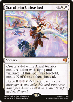 Create a 4/4 white Angel Warrior creature token with flying and vigilance. If this spell was foretold, create X of those tokens instead. Foretell {X}{X}{W} (During your turn, you may pay {2} and exile this card from your hand face down. Cast it on a later turn for its foretell cost.)