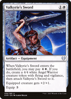 When this Equipment enters, you may pay {4}{W}. If you do, create a 4/4 white Angel Warrior creature token with flying and vigilance, then attach this Equipment to it. Equipped creature gets +2/+1. Equip {3}