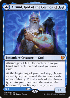 Create two 1/1 blue Bird creature tokens with flying. Take an extra turn after this one. Exile Alrund's Epiphany. Foretell {4}{U}{U} (During your turn, you may pay {2} and exile this card from your hand face down. Cast it on a later turn for its foretell cost.)