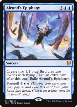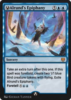 Take an extra turn after this one. If this spell was foretold, create two 1/1 blue Bird creature tokens with flying. Exile Alrund's Epiphany. Foretell {5}{U}{U}