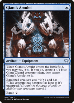 When this Equipment enters, you may pay {3}{U}. If you do, create a 4/4 blue Giant Wizard creature token, then attach this Equipment to it. Equipped creature gets +0/+1 and has "This creature has hexproof as long as it's untapped."(It can't be the target of spells or abilities your opponents control.) Equip {2}