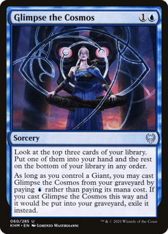 Look at the top three cards of your library. Put one of them into your hand and the rest on the bottom of your library in any order. As long as you control a Giant, you may cast this card from your graveyard by paying {U} rather than paying its mana cost. If you cast this card this way and it would be put into your graveyard, exile it instead.