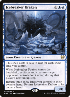 Affinity for snow lands (This spell costs {1} less to cast for each snow land you control.) When this creature enters, artifacts and creatures target opponent controls don't untap during that player's next untap step. Return three snow lands you control to their owner's hand: Return this creature to its owner's hand.