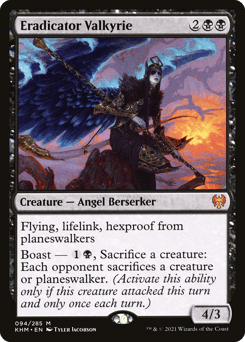Flying, lifelink, hexproof from planeswalkers Boast — {1}{B}, Sacrifice a creature: Each opponent sacrifices a creature or planeswalker. (Activate only if this creature attacked this turn and only once each turn.)