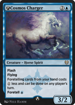 Flash Flying Foretelling cards from your hand costs {1} less and can be done on any player's turn. Foretell {2}{U} (During your turn, you may pay {2} and exile this card from your hand face down. Cast it on a later turn for its foretell cost.)