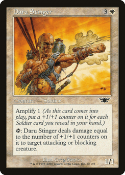 Amplify 1 (As this creature enters, put a +1/+1 counter on it for each Soldier card you reveal in your hand.) {T}: This creature deals damage equal to the number of +1/+1 counters on it to target attacking or blocking creature.