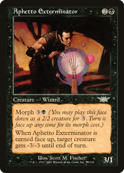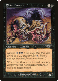 Morph {3}{B}{B} (You may cast this card face down as a 2/2 creature for {3}. Turn it face up any time for its morph cost.) When this creature is turned face up, destroy target nonblack creature. It can't be regenerated.