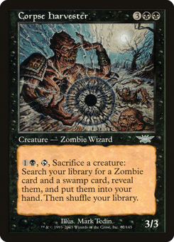 {1}{B}, {T}, Sacrifice a creature: Search your library for a Zombie card and a Swamp card, reveal them, put them into your hand, then shuffle.