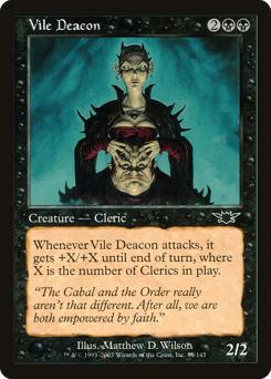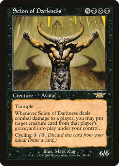 {T}, Sacrifice three Clerics: Search your graveyard, hand, and/or library for a card named Scion of Darkness and put it onto the battlefield. If you search your library this way, shuffle.