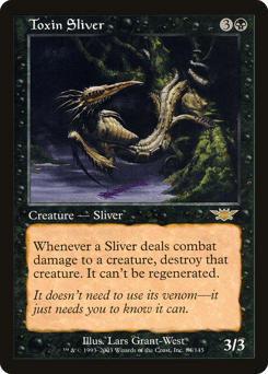 Whenever a Sliver deals combat damage to a creature, destroy that creature. It can't be regenerated.