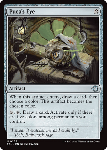 When this artifact enters, draw a card, then choose a color. This artifact becomes the chosen color. {3}, {T}: Draw a card. Activate only if there are five colors among permanents you control.