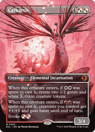 When this creature enters, if {W}{W} was spent to cast it, create two 1/1 green and white Kithkin creature tokens. When this creature enters, if {R}{R} was spent to cast it, creatures you control get +1/+1 and gain haste until end of turn. Evoke {R/W}{R/W} (You may cast this spell for its evoke cost. If you do, it's sacrificed when it enters.)