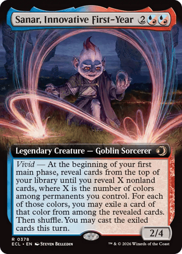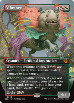 Trample Vivid — When this creature enters, reveal cards from the top of your library until you reveal X permanent cards, where X is the number of colors among permanents you control. Put any number of those permanent cards onto the battlefield, then put the rest of the revealed cards on the bottom of your library in a random order.