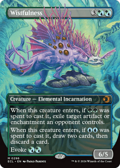 When this creature enters, if {G}{G} was spent to cast it, exile target artifact or enchantment an opponent controls. When this creature enters, if {U}{U} was spent to cast it, draw two cards, then discard a card. Evoke {G/U}{G/U} (You may cast this spell for its evoke cost. If you do, it's sacrificed when it enters.)