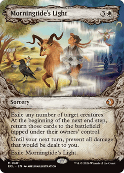 Exile any number of target creatures. At the beginning of the next end step, return those cards to the battlefield tapped under their owners' control. Until your next turn, prevent all damage that would be dealt to you. Exile Morningtide's Light.