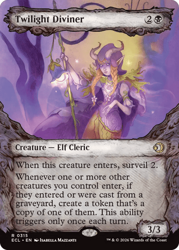 When this creature enters, surveil 2. (Look at the top two cards of your library, then put any number of them into your graveyard and the rest on top of your library in any order.) Whenever one or more other creatures you control enter, if they entered or were cast from a graveyard, create a token that's a copy of one of them. This ability triggers only once each turn.