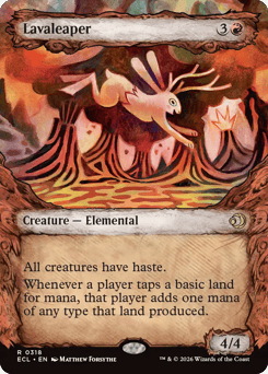 All creatures have haste. Whenever a player taps a basic land for mana, that player adds one mana of any type that land produced.
