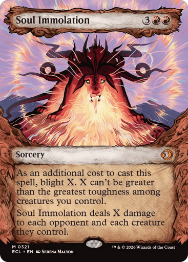 As an additional cost to cast this spell, blight X. X can't be greater than the greatest toughness among creatures you control. (Put X -1/-1 counters on a creature you control.) Soul Immolation deals X damage to each opponent and each creature they control.