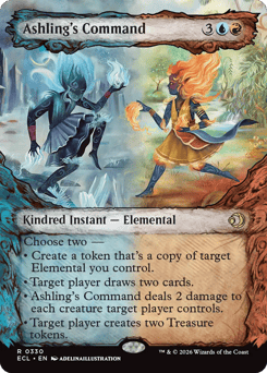 Choose two — • Create a token that's a copy of target Elemental you control. • Target player draws two cards. • Ashling's Command deals 2 damage to each creature target player controls. • Target player creates two Treasure tokens.