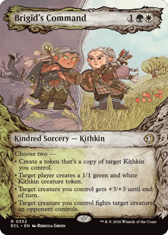 Choose two — • Create a token that's a copy of target Kithkin you control. • Target player creates a 1/1 green and white Kithkin creature token. • Target creature you control gets +3/+3 until end of turn. • Target creature you control fights target creature an opponent controls.